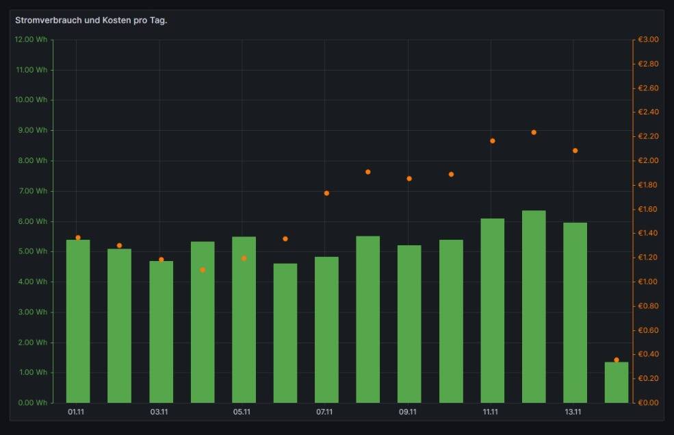 So sieht mein Tibber Verbrauch der letzten 14 Tage aus im Gegensatz zu den Kosten pro Tag ( Ohne Netzentgelte und Grundgebühr. Das wären dann ca. 50 Cent mehr pro Tag ) Bei der Grafik kommt es mehr darauf an, wie die Kosten pro Tag variieren, je nachdem zu welchem Preis und zu welcher Zeit man Strom verbraucht hat.