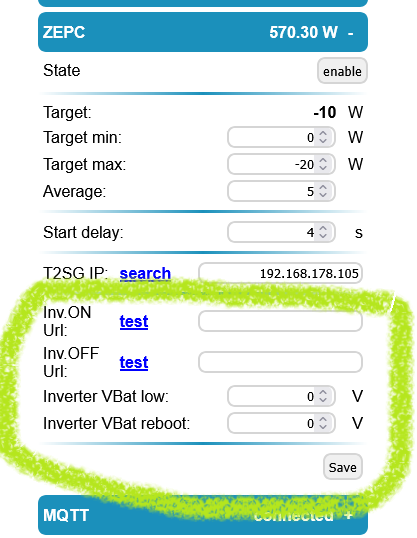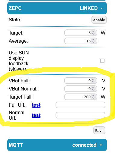 Die json-Werte nutze ich, um, wenn der Akku komplett voll ist, den Wechselrichter in der Leistung zu drosseln, damit nicht zuviel ins Netz geht Sobald der Meanwell die Meldung "Full delayed" oder Full ausgibt, springt die Nulleinspeisungsregelung an. Sonst macht sie das nur, wenn der MW mit Maximalleistung lädt. Sonst würde sich die Nulleinspeisung mit der MW-Laderegelung konkurrieren.