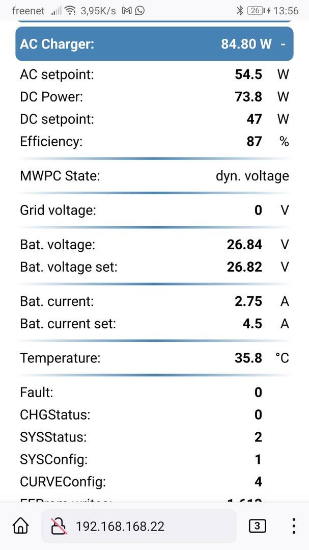 Habe auch schon versucht händisch eine Leistungsvorwahl (AC Setpoint) von z.b. 50W vorzugeben. Den AC setpoint nimmt er auch an. Aber das Ladegerät lädt dann dennoch oft mit 120W DC. Und manchmal lädt er auch mit den vorgegeben 50W DC. Habe aber noch kein Muster entdecken können.