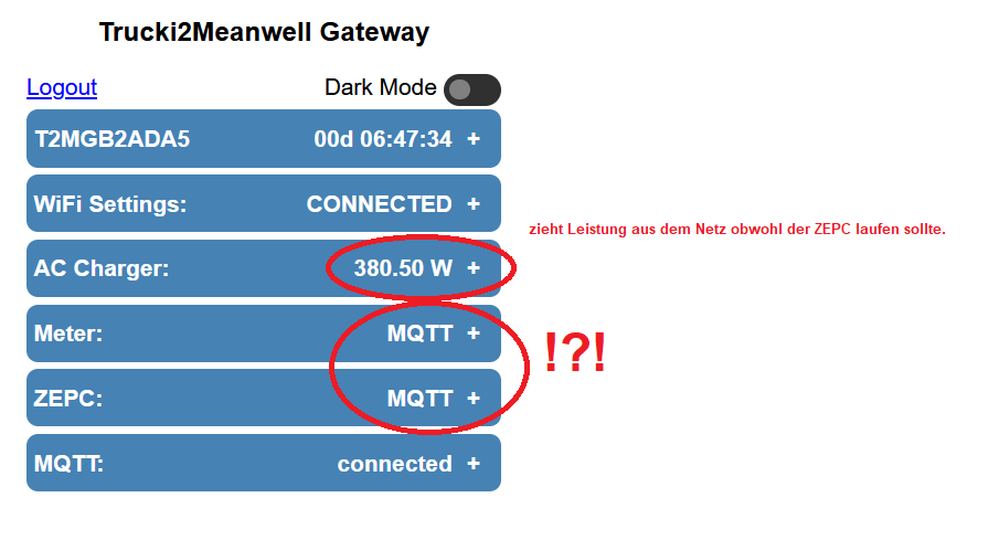 Hallo zusammen, ich hab seit neustem das Problem, dass ich im T2MG UI bei "Meter" und "ZEPC" bloss "MQTT" stehn habe, und nicht wie erwartet, den vom Shelly zurückgemeldeten Momentanverbrauch und die aktuelle Leistung des ZEPC. In so einem Fall, speist der Inverter dann mit dem von mir hinterlegten Maximalwert ein und der Meanwell lädt indem er noch Energie aus dem Netz zukauft, was absoluter Unfug ist.