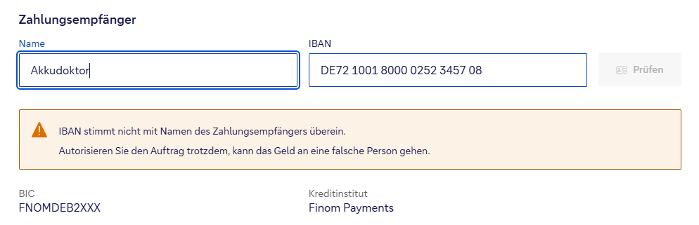 Was auch gehen sollte: Man kann bei der Bank in der Regel Alias-Namen hinterlegen lassen. Du könntest also "Akkudoktor" hinterlegen lassen. Dann funktioniert die Namensprüfung wieder.
