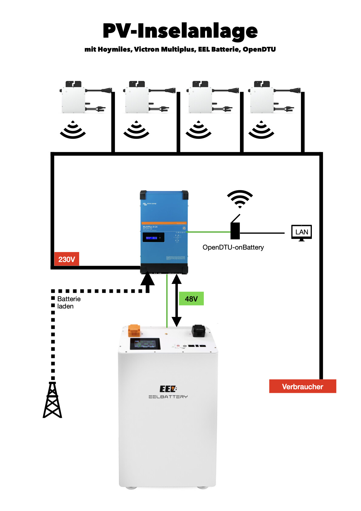 Als Batterie schwebt mir eine EEL vor. Die 16kWh sind sicher extrem üppig dimensioniert, aber für das Geld bekommt man anderswo 5kWh! Ausserdem möchte ich nicht dass der große rote Drache meine Anlage checkt - die EEL hat so ein Schweinkram nicht. Dadurch schaffe ich mir eine üppige Notstromversorgung. Und vor allem ist das ein DIY-Kit! Ich bekomme die Komponenten in mehreren Paketen zugesandt und kann die Batterie im Keller zusammenbauen wo sie auch ihren Standort hat. Um das zu entscheiden muss ich aber mit den Hoymiles zunächst testen wieviel Ertrag die Panels wirklich bringen - 2000W zusammen wäre natürlich ein Träumchen …