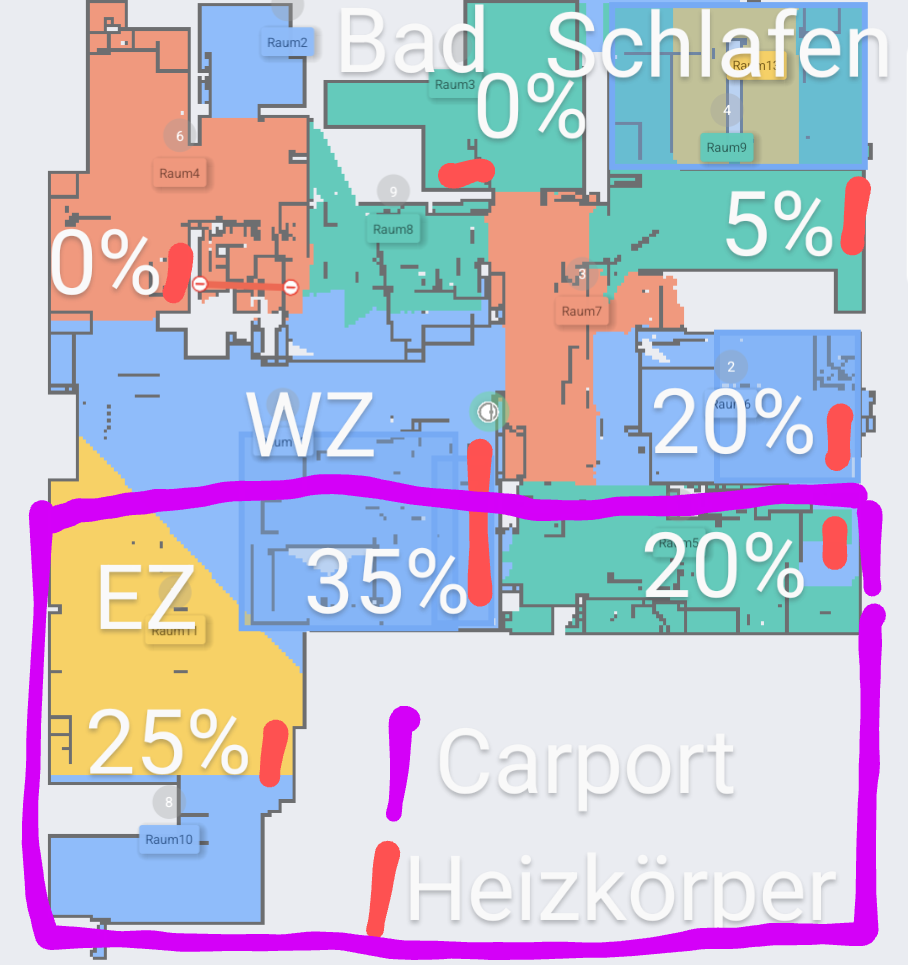 Hier mal mein Grundriss (Staubsaugerrobbi sei Dank) mit Heizkörpern inkl. Verbrauchseinheiten Anteil, dem Bereich offenem Carport. WZ + EZ + Küche ist ein großer Raum. Gesamtwohnfläche ohne Terrasse 120qm, in der Abrechnung werden 115 qm Heizfläche berücksichtigt.