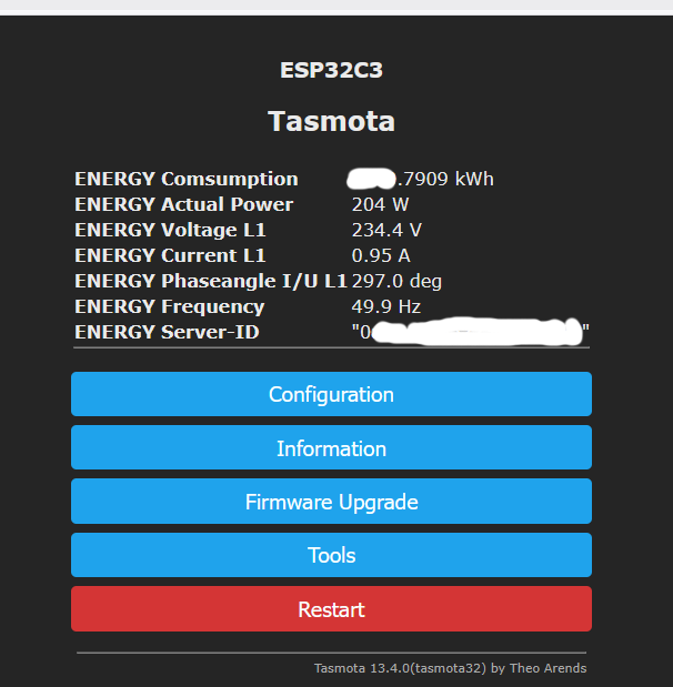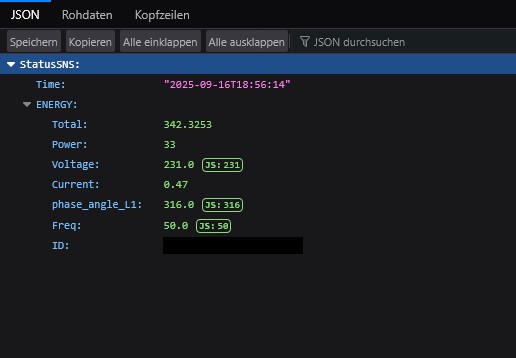 {"StatusSNS":{"Time":"2025-09-16T09:29:08","ENERGY":{"Total":xyzx.8153,"Power":435,"Voltage":232.4,"Current":1.49,"phase_angle_L1":0.0,"Freq":49.9,"ID":"xyz …. xyz"}}}