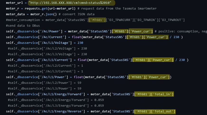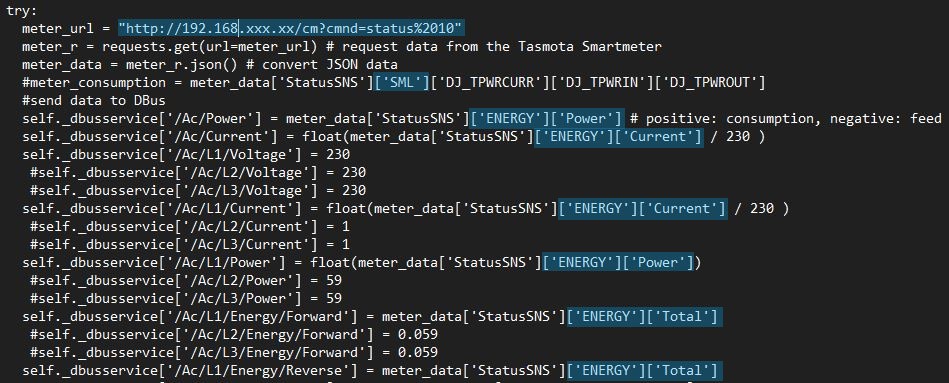 Aus deinen Werten oben entnehme ich aber das es am Ende genau gleich wie bei mir im Script stehen muss. Ich gebe dir mal zwei Screenshots in dem ich alle wichtigen Stellen markiere wo du was ändern must einmal das Original und einmal überarbeitet mit den JSON "Werten" die du beim aufrufen der Adresse oben bekommst.... Dazu must du die dbus-tasmota-smartmeter.py bearbeiten ab Zeile 72 - 91.... Als erstes IP Adresse in Zeile 72 eintragen...