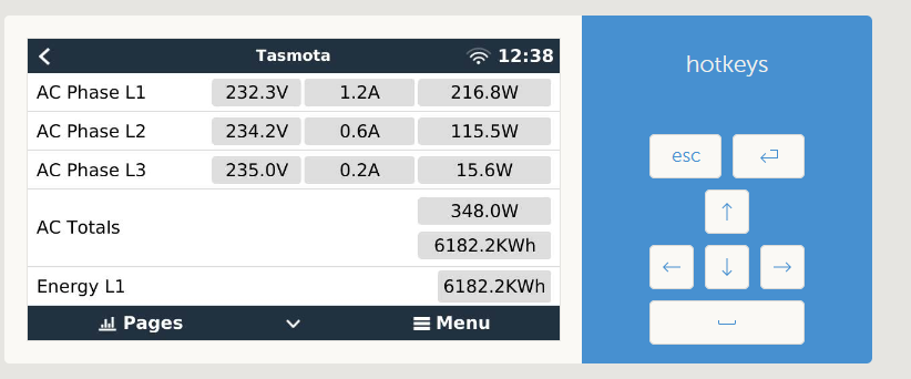 Ich habs ausprobiert mit "Voltage" dann spinnt es und zeigt immer 1V es blinken aber kurz die 230V auf. Aber vielleicht mache ich einen Fehler und es braucht noch was anderes im Script damit es funktioniert. Denn Frequenz und Phasenwinkel hatte ich auch schonmal probiert, habs aber irgentwie nicht hinbekommen und dann einfach sein gelassen. Vielleicht bekommst du es ja hin, dann gib bitte bescheid WIE . Hmm und Strom geht ja auch noch nicht... hat mich nicht weiter gejuckt aber da muss ich wohl doch selbst auch nochmal ran .