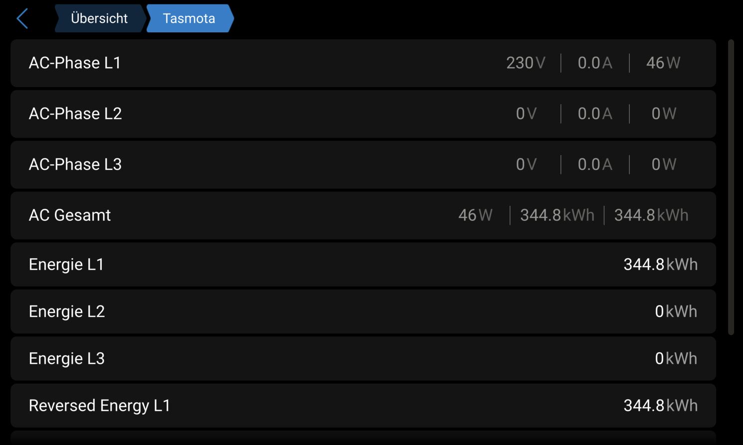 L2 und L3 sind rausgeflogen, Spannung und Strom werden korrekt ausgelesen. Phasenwinkel und Frequenz geht wohl anscheinend nicht so einfach höchstens in einer extra Kachel im GUI. Nachher mehr dazu....
