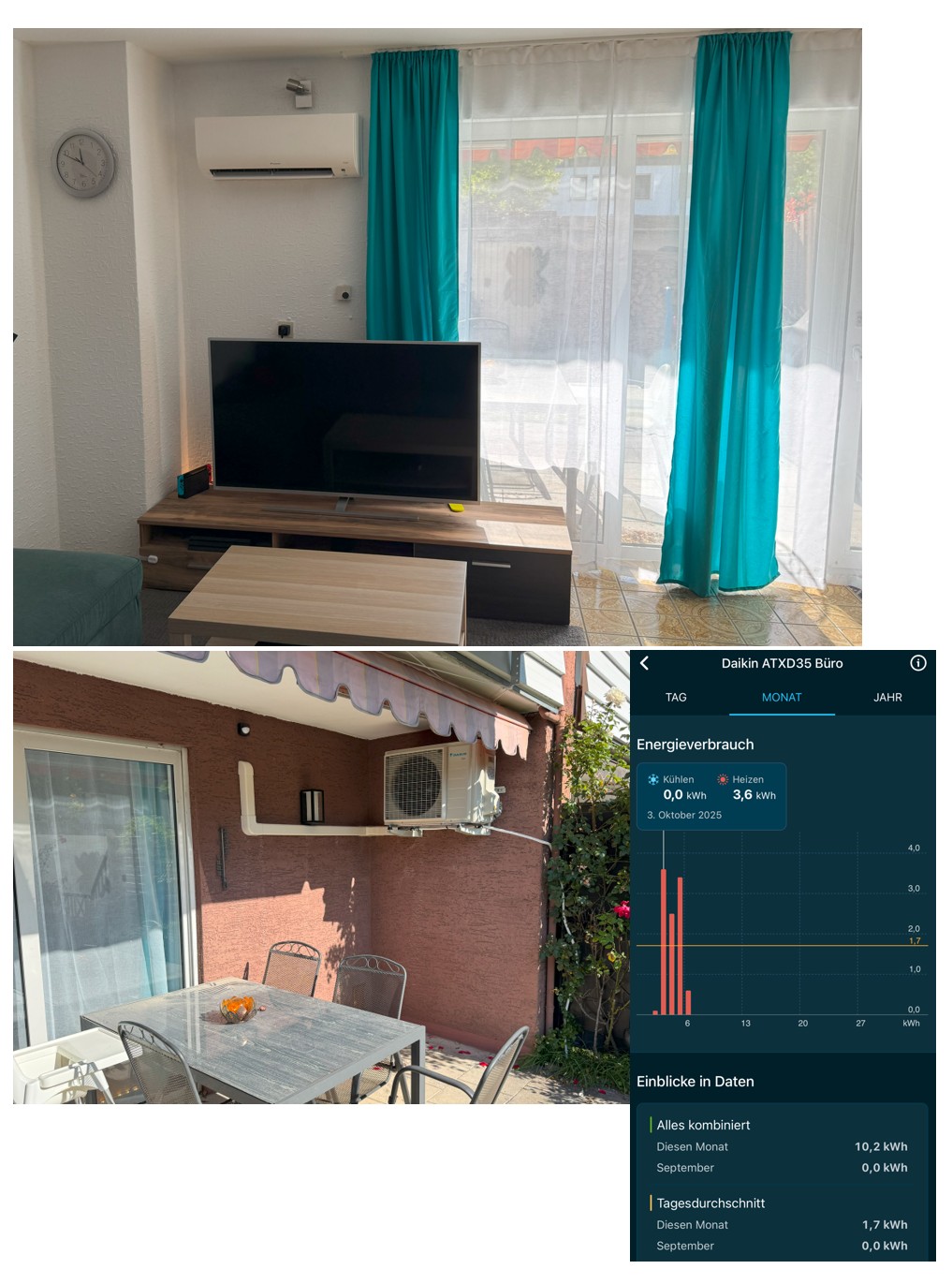Die Daikin ATXM35 (Single-Split) auf Etage 1 kommt dabei auf 177 kWh Verbrauch bei 1.034,9 kWh thermischer Erzeugung im Jahr 2025. Jahresarbeitszahl 5,85 also bisher, für eine Wärmepumpe finde ich ein super Wert.
