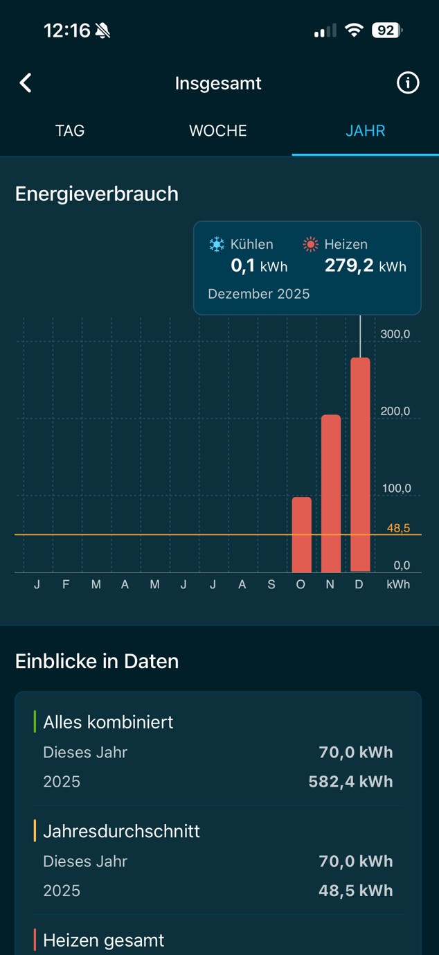 Verbrauchswerte zum Heizen im Jahr 2025Die ersten 3 Monate der Heizsaison sind nun rum. Verbrauch der Anlagen von Oktober bis 31.12.2025 waren insgesamt 582,4 kWh Strom. Somit keine 200€ Heizkosten bisher für die halbe Heizsaison gehabt. Ist deutlich besser als ich anfangs erhofft habe.