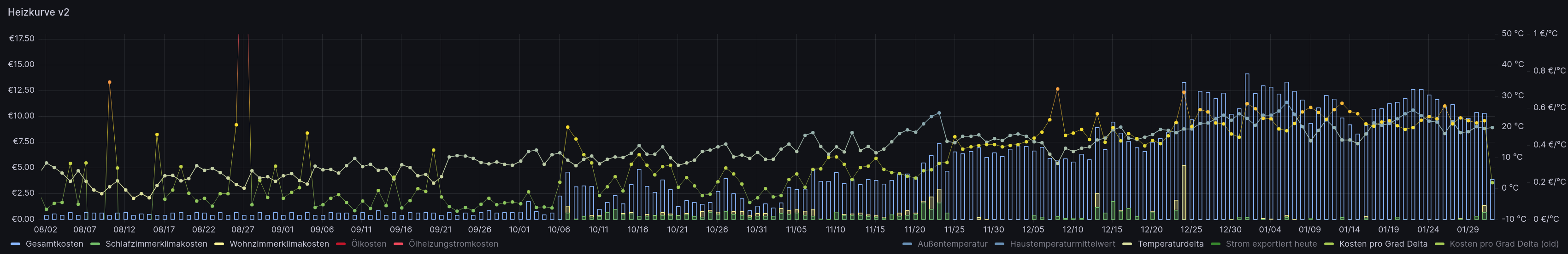 Man sieht, dass bis 4.11. der Wert deutlich besser war dank der Klimas. Aber natürlich weil nur die Primärenergie, nicht die Heizenergie betrachtet wird, den COP kann ich ja nicht für jeden Betriebszustand sauber ermitteln (noch!).