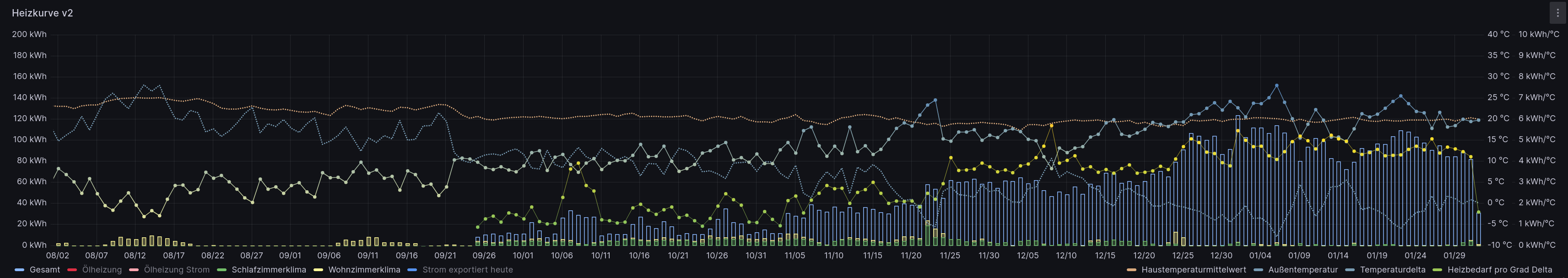 Grün-Gelb mit Punkten ist der Primärenergiebedarf in kWh pro Grad Delta zur Außentemperatur.