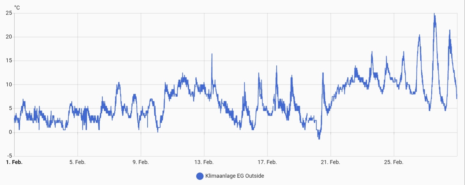 Blau gestrichelt die Außentemperatur.