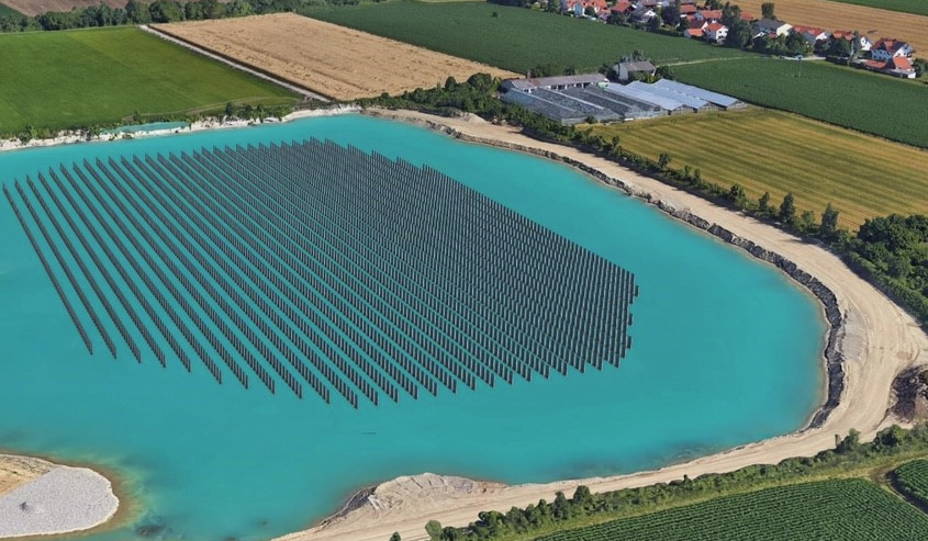 Heise hat auch ein schönes Bild im Newsticker: Schwimmende vertikale Photovoltaikanlage mit 1,87 MW auf Kiessee eröffnet | heise online