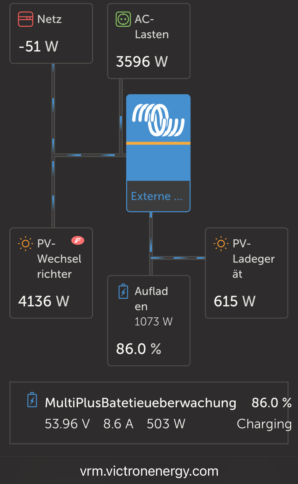 Werd doch bitte konkreter. Was hast Du genau im Einsatz? Auf dem Bild sieht man nur einen Screenshot von VRM. Da scheint ein Fronius-Wechselrichter installiert zu sein, ein anderer Wechselrichter am Akku (?Victron MPPT?), ein Akku unbekannter Größe und Bauart. Erahnen kann man einen Multiplus oder anderen Victron-Wechselrichter. Das unterscheidet VRM nicht.