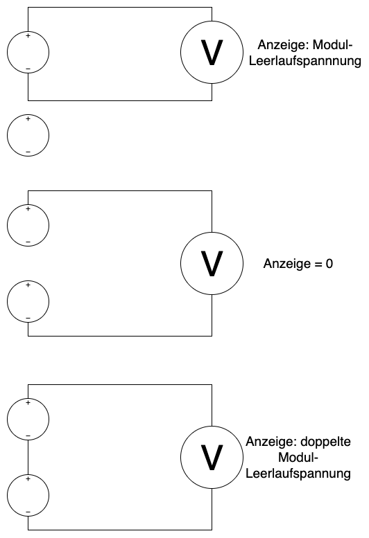 Wenn 4 Kabel ankommen, kann man vor dem Anschließen einfach mit einem Multimeter jeweils zwischen + und - messen. Bei 2 Kombinationen wird man die Leerlaufspannung der Module messen, bei den 2 anderen Kombinationen nichts. Steckt man bei einer der letzten Kombinationen die Kabel zusammen, sollte an den beiden verbleibenden offenen Enden die doppelte Spannung gemessen werden.