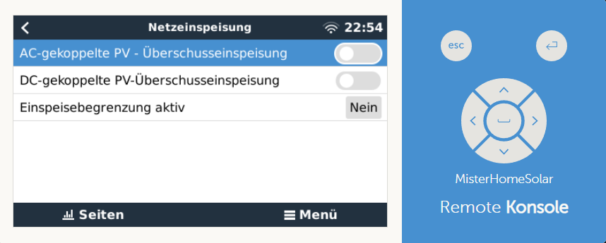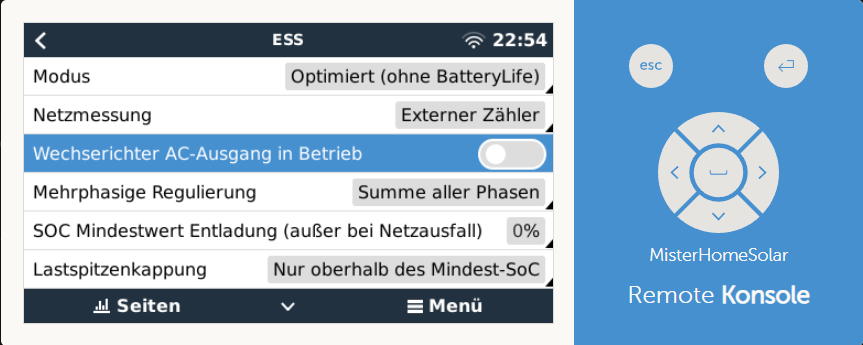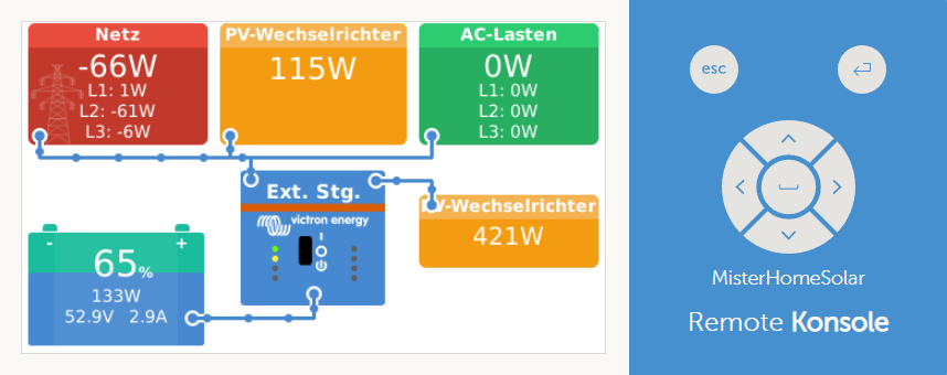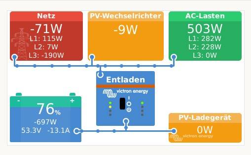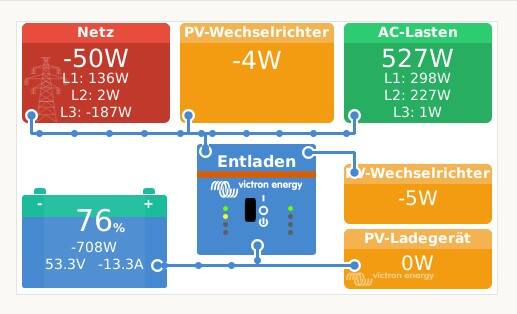 Das VRM Portal und die Remote Console zeigen die AC-Lasten mit 0 sobald die PV Leistung höher ist als die tatsächliche AC-Last, ist die PV Last niedriger, stimmt die AC-Last Anzeige.