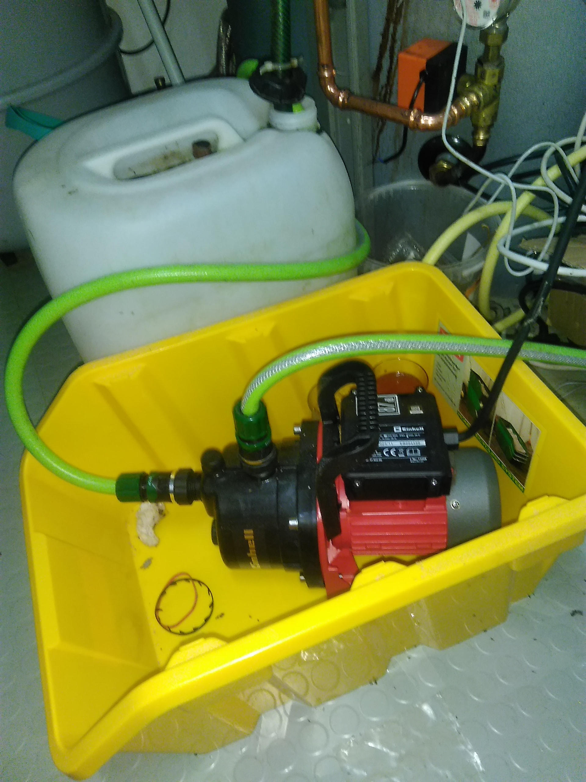 Wegen der Schweinerei steht die Pumpe in einer Wanne.