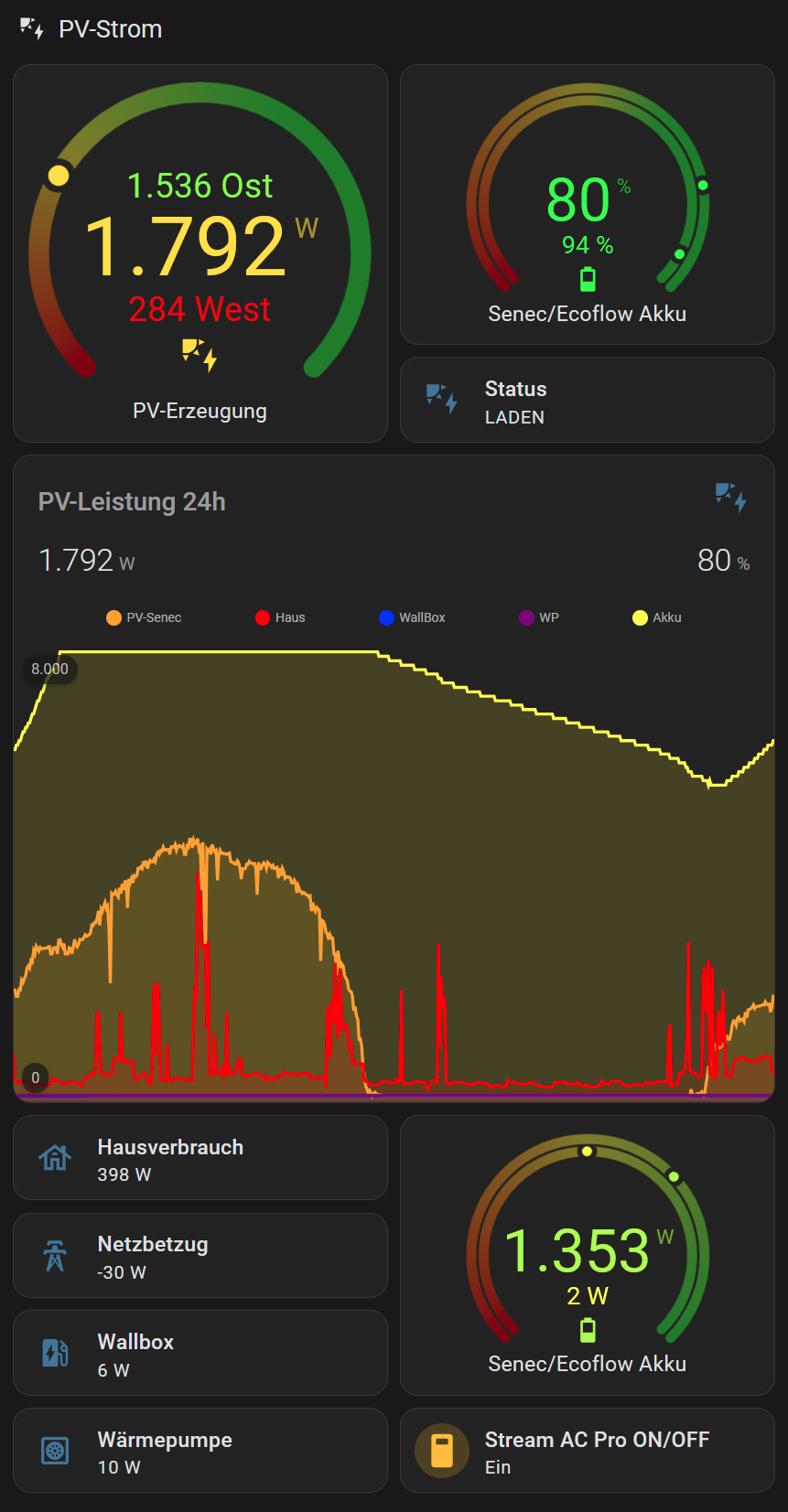 Bei abgeschaltetem Senec Speicher läßt sich das Haus bis 800W prima mit dem Stream versorgen und die Nulleinspeisung arbeitet in Kombination mit dem Pulse zügig. Auch die Beladung mit PV-Überschuß klappt in der Kombination problemlos.