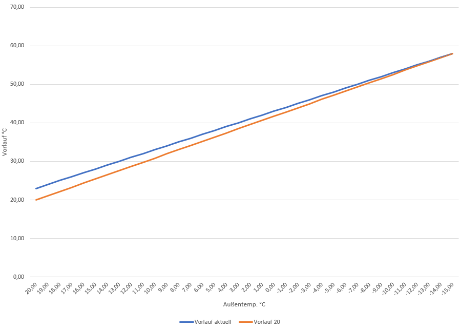 Einzig, was mich wundert, bei 20°C Außentemperatur sollte die Vorlauftemperatur eigentlich nicht mehr höher als Außentemperatur sein müssen da es (und noch ein eigentlich) eigentlich keinen Heizbedarf mehr gibt.