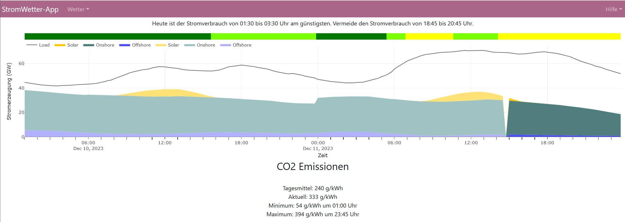"Der Graph zeigt die vorgesagte Stromproduktion für Windkraft und Solarenergie an. Die Linie im oberen Bereich zeigt den vorhergesagten Verbrauch an. Die Hintergrundfarbe im oberen Bereich des Graphen is ein Maß für die CO2 Intensität der Stromerzeugung. Blautöne signalisiseren wenig CO2-Emission, Rottöne viel.