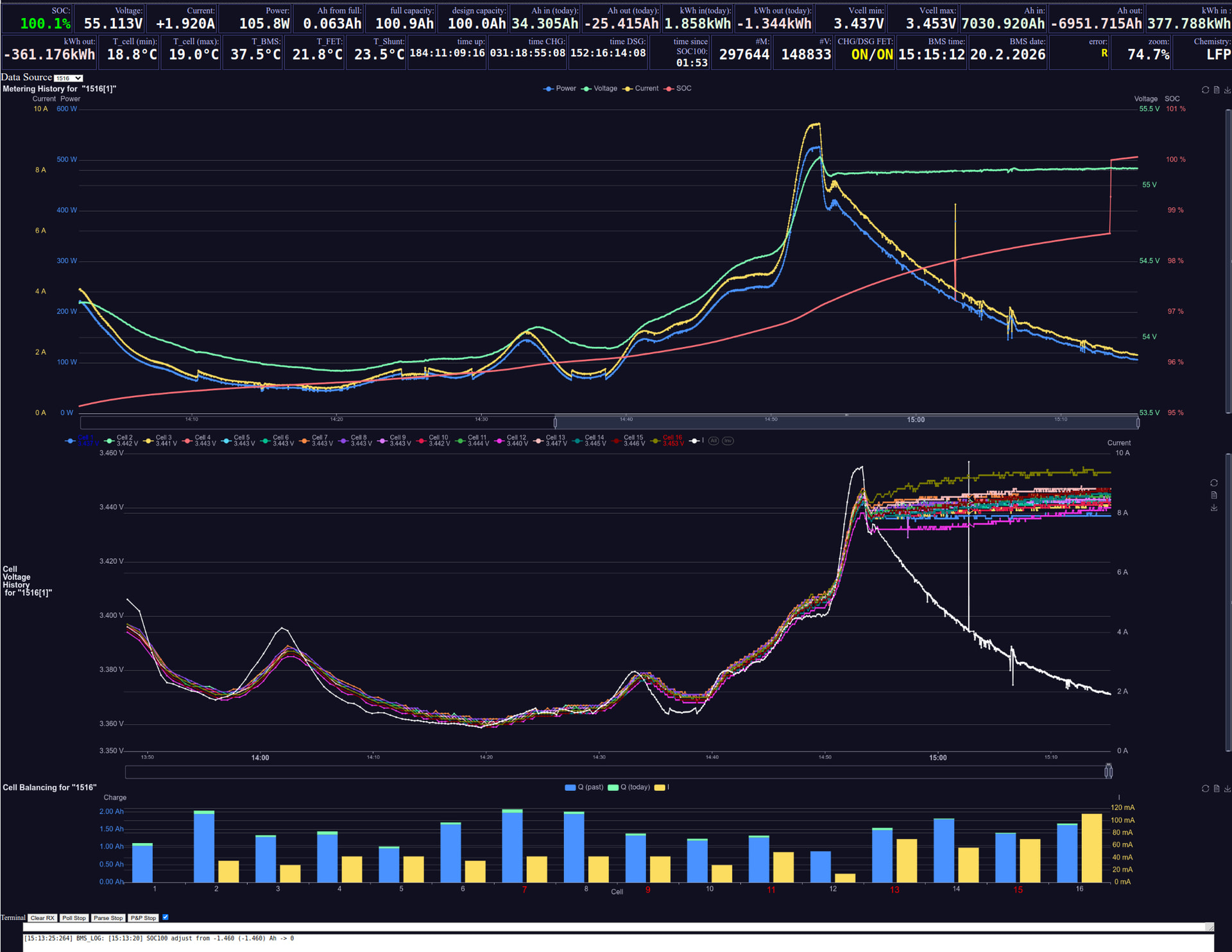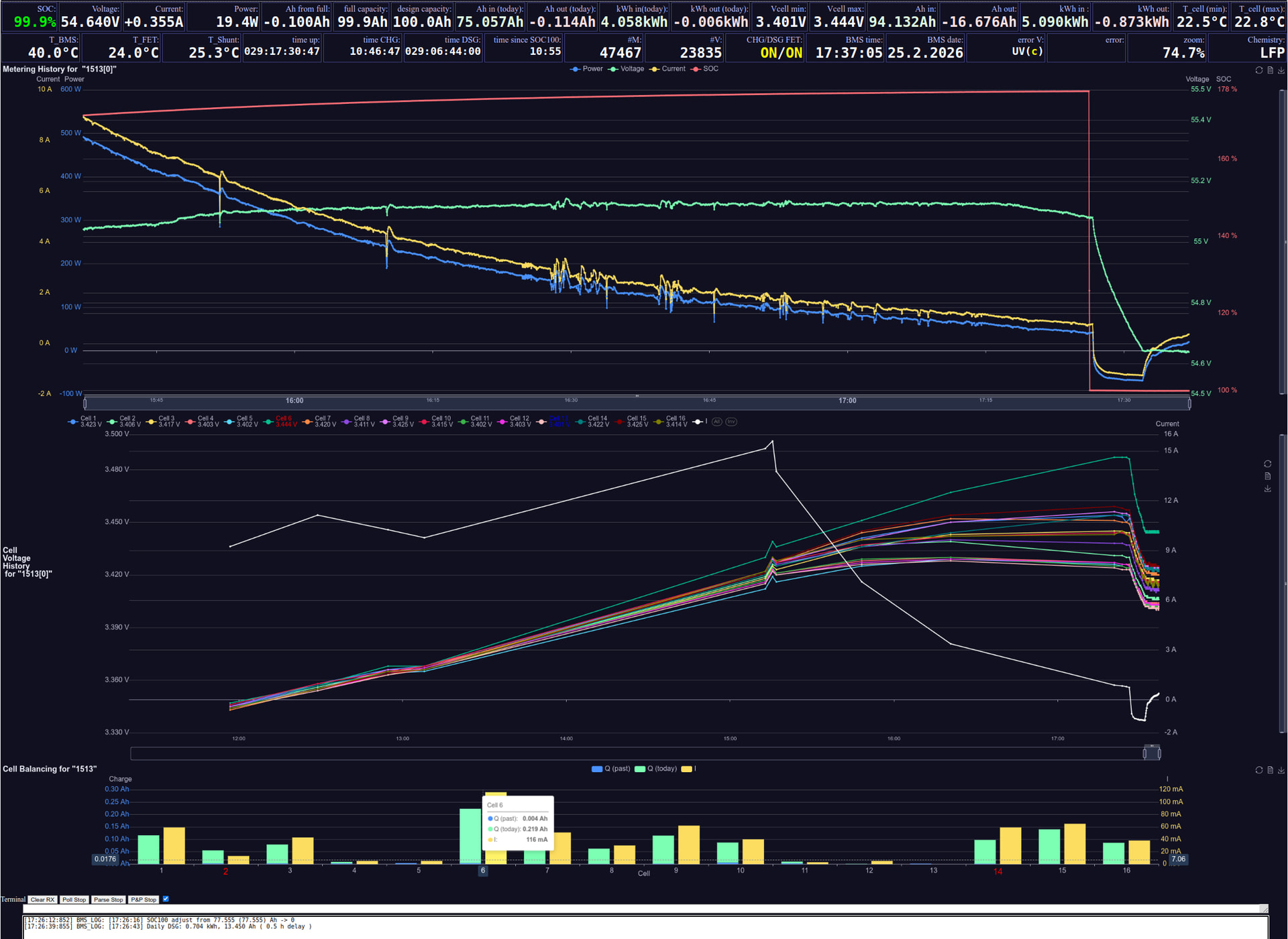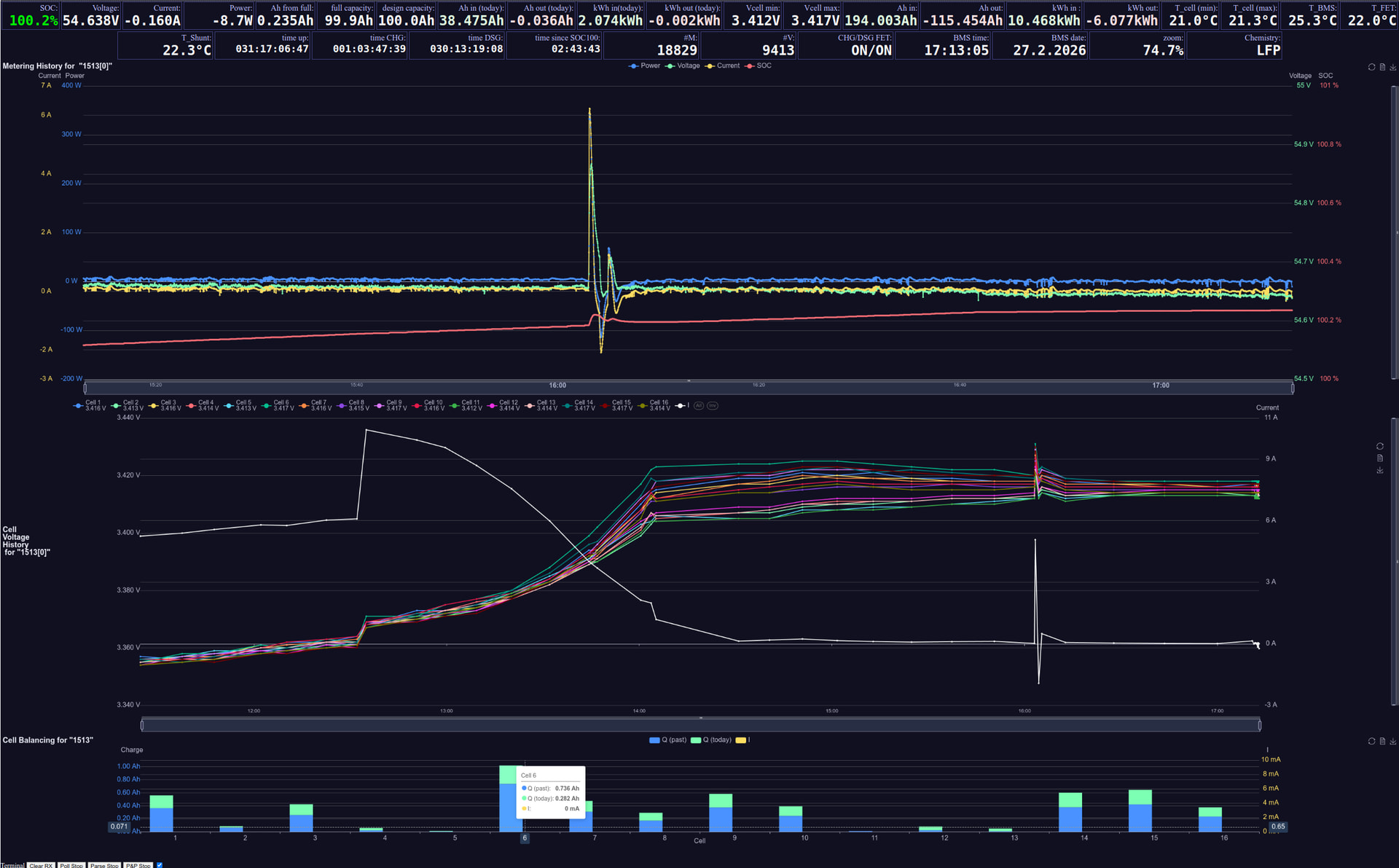 Es ist auch bemerkenswert wieviel Ladung die Zellen hier beim ersten Volladen noch nach Erreichen von 3.42 V ziehen, nämlich > 9 Ah. Das verändert sich an den Folgetagen deutlich.