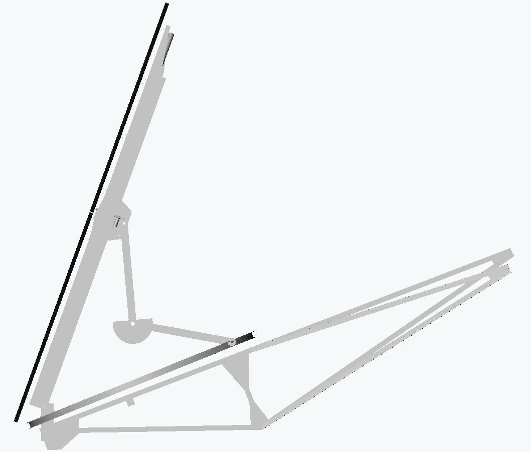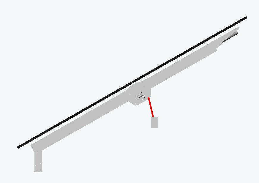 Das Bild zeigt den Ist-Zustand über der Dachfläche von der Seite, teilweise mit Bildbearbeitungsprogramm ergänzt. Die beiden senkrechten grauen Rechtecke sind die Teile die durch die Dachfläche gehen. Der Drehpunkt ist links unten. Die rote Line stellt das momentane, fixe Provisorium da. Der große graue "Klumpen" in der Mitte sind Knotenbleche. Es sind vier Schienen je Modulreihe verbaut. Wer aufmerksam mitgelesen hat, die waren sehr günstig.
