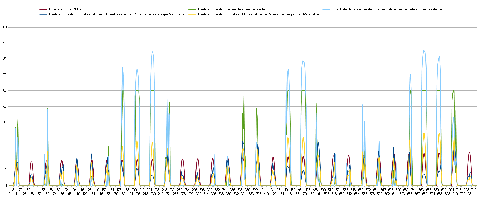 Was die Graphen darstellen steht in der Legende. Jeder Datenpunkt ist eine Stunde (x-Achse), die Daten über die Stunde sind summiert. Wobei das für normierte Werte egal ist, nur die Minuten der Sonnenscheindauer sind tatsächlich noch eine Summe.