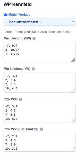 Wirklich eine tolle Idee und für WP Interessierte sehr hilfreich wenn es an die Auswahl der WP geht. Leider geben die Hersteller meistens nur Werte für W35 oder W55 an. Wäre es möglich die Werte und Berechnungen auch auf W45 zu erweitern? Ich könnte mir Vorstellen, dass viele Altgebäude die mit Radiatoren ausgestattet sind dann noch hilfreichere Werte erhalten, da diese ja häufig mit VL Temperaturen unter 55°C betrieben werden können. Vielleicht ist es sogar möglich die Wxx frei wählbar zu machen.