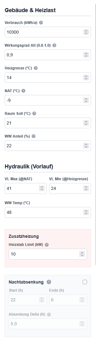 Kinder, insgesamt verlangen wir (ich) glaube ich zuviel von dem Tool. Eine Wärmepumpeninstallation, vor allem im Bestand, ist ein sehr komplexes Unterfangen. das kann kein Tool der Welt komplett abbilden.