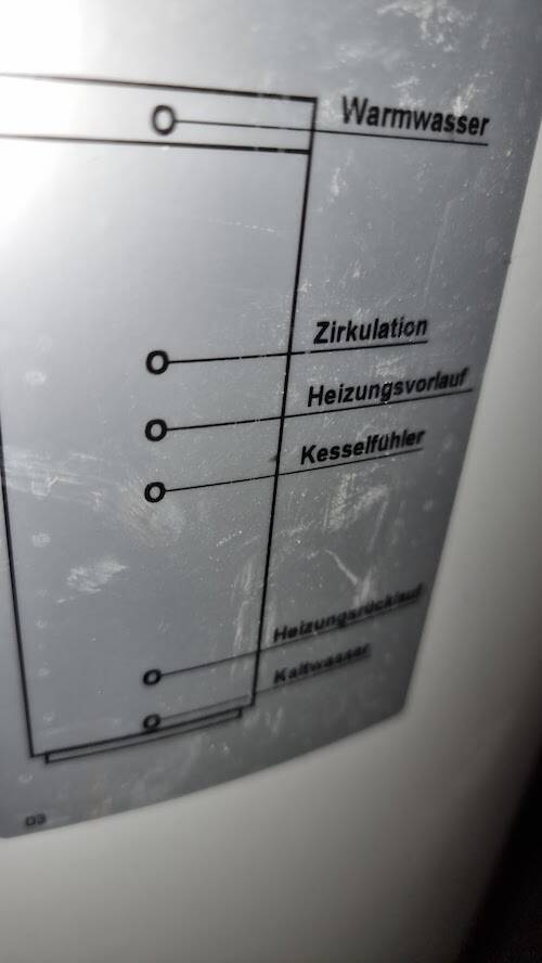 Bei mir ist es bislang so: Eine Gastherme beheizt einen externen Warmwasserspeicher. Am WW-Speicher hängt eine Zirkulationsleitung für die letzte Zapfstelle in der Küche. So sieht der Anschluss am Speicher aus: