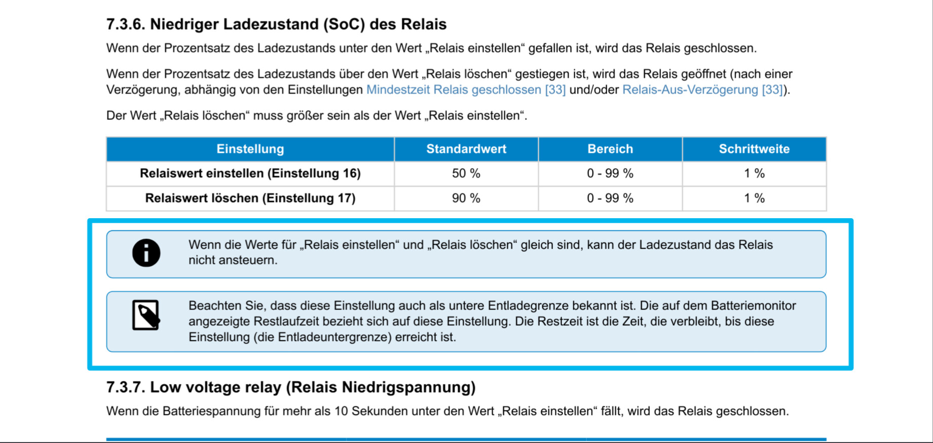 In meiner DIY Konfiguration schaltet der Relais-Ausgang des BMV den Grid-Tie-Inverter. über 33% SOC wird er aktiviert und unter 25% deaktiviert. Eigentlich sollte der Entladeboden darauf keinen Einfluss haben. Hat er aber doch. Der Alarmwert für niedrigen SOC und der Entladeboden sind FEST VERBUNDEN. D.h. wenn ich in den Batterieeinstellungen den Entladeboden auf z.B. 5% setze, weil die Restzeit-Anzeige für mich dann aussagekräftiger wird, übernimmt die Relais-Einstellung diese 5% sofort als unteren SOC Wert, ohne Nachfrage oder Hinweis. Und entlädt dann den Akku bis 5%, statt 25%.