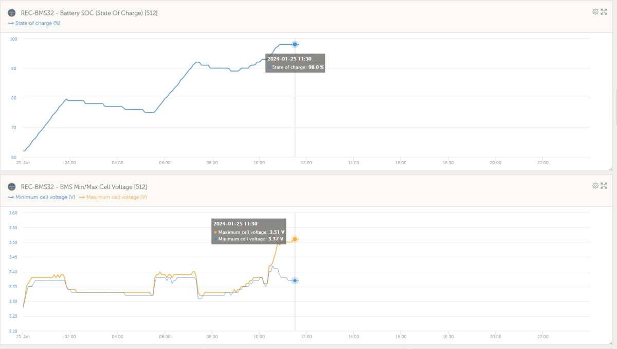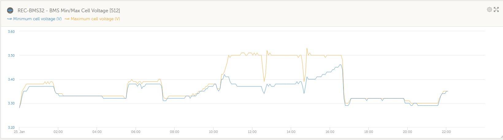 Ein bis 2 Stunden länger Sonne, und die Zellen wären wieder beieinander. das REC regelt den WR sauber aus, damit der Balancer die Möglichkeit hat zu balancen.