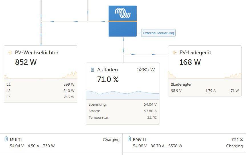 Des weiteren hat ja auch der Victron Multiplus seine eingestellten Grenzen, die er nicht über/unter schreitet. Der Multi misst im Hintergrund ja immer mit.