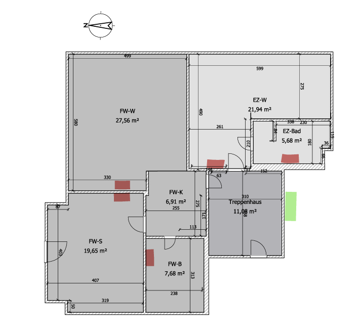 Mögliche Einbauort habe ich schon mal rot markiert. Die grüne Markierung wäre das AG. Dort wäre auch Platz für ein zweites. Die Rohre können leicht über den Spitzboden in die Zimmer verlegt werden.