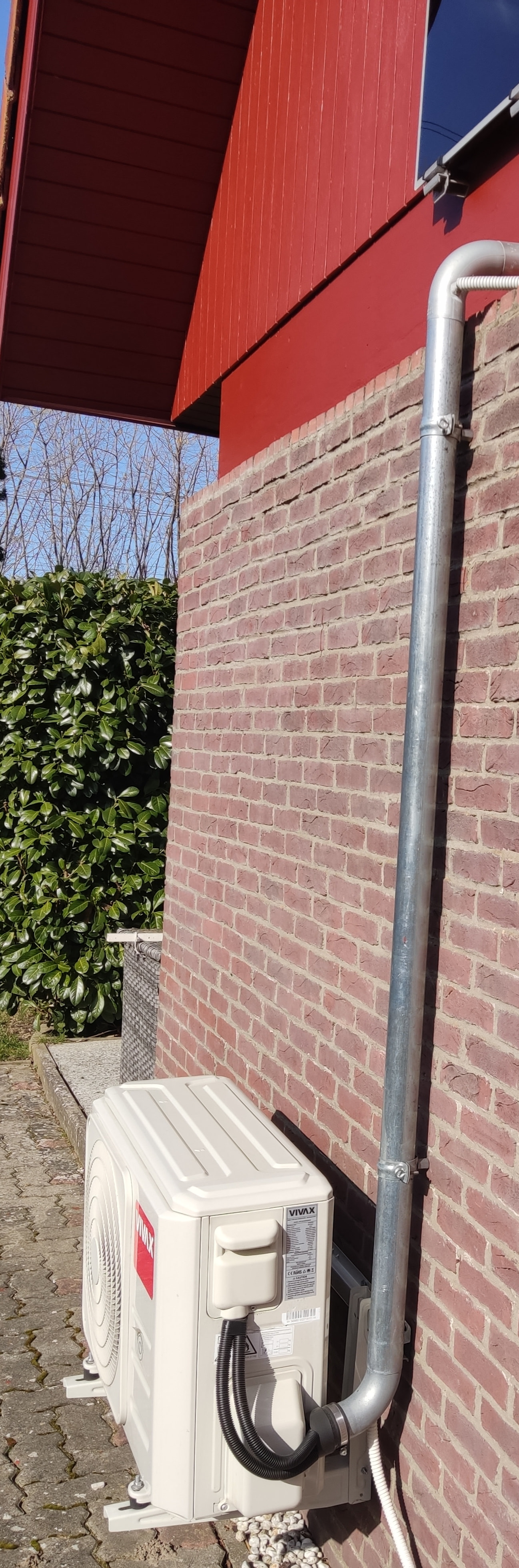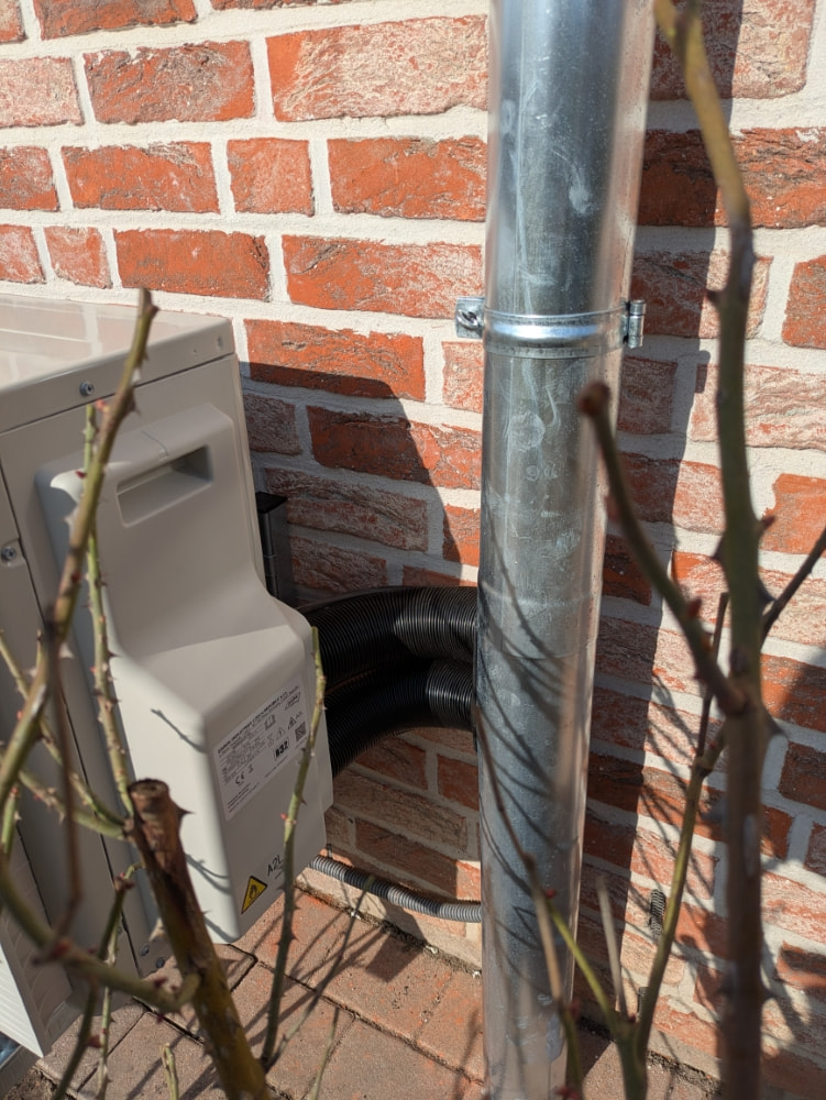 Ich habe die Leitungen zuerst von außen durch die Hauswand gezogen dann am Innengerät verschraubt, natürlich inklusive die elektrische Steuerleitung. Danach das kurze Verbindungsstück und den ersten 90 Grad Bogen. Danach kam das lange Verbindungsrohr dran was ein bisschen tricki ging und zum Schluss kam wieder ein 90 Grad Bogen mit einer Gummimuffe welche aber ein Loch für Kondensatwasser ( Schwitzwasser) hat. Damit meine ich aber nicht das Kondensatwasser vom Innengerät. Meine nächste Heizung, Klima werde ich aber mit einer Nummer dicker das Rohr verbauen. Das Rohr, die Bögen und die Halterungen habe ich im Großhandel gekauft.