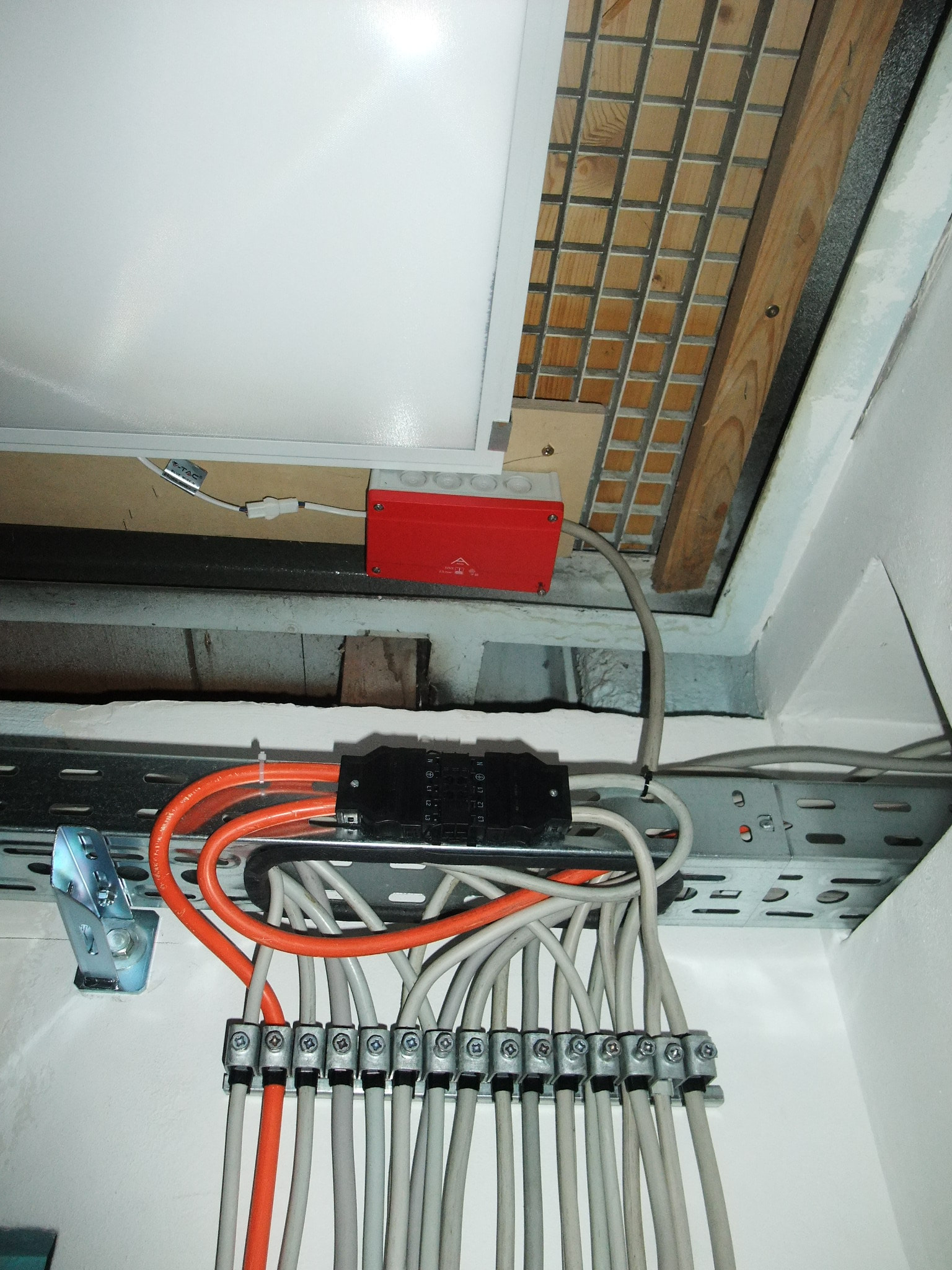 Um nicht zwei Beleuchtungen für jede Spannung völlig getrennt montieren zu müssen, hier ein handelsübliches LED Einlegepanel, welches sowohl an 48Volt DC als auch gleichzeitig an 230 Volt AC angeschlossen wurde. Das bedeutet nur eine physisch vorhandene Leuchte zum Betrieb mit zwei unabhängigen Spannungsversorgungen und einer Schaltstelle. Eine mit mehreren Schaltstellen erweiterte Version ist derzeit noch in Erprobung.