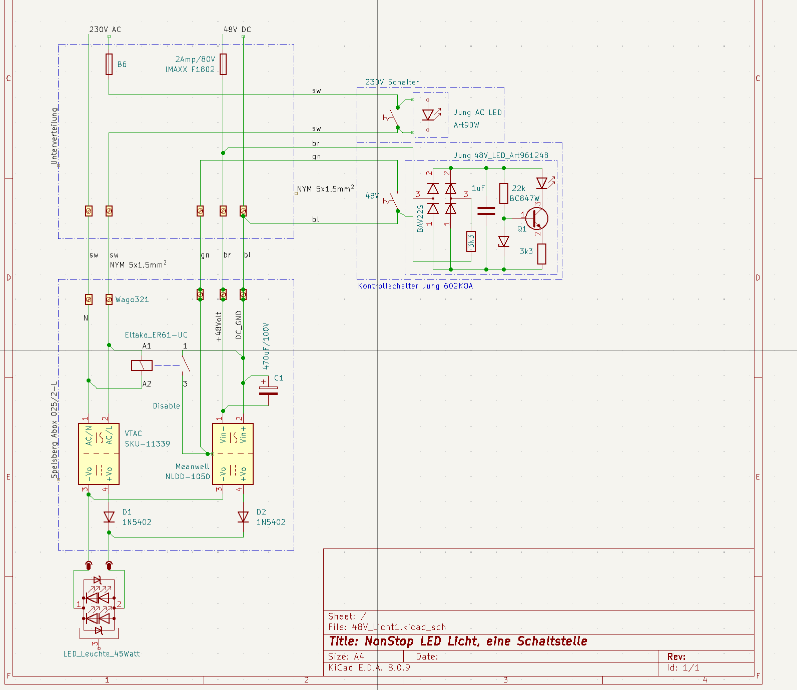 Links oben im Schaltbild sind die beiden Spannungsversorgungen 230V AC und 48V DC. Der AC Lichtkreis ist mit einer 6 Amp Neozed Sicherung, einem 6 Amp Automaten oder mit einer sonst in der Installationstechnik üblichen Sicherung abgesichert. Der Schalter dazu ist ein gewöhnlicher zweipoliger Lichtschalter in welchem auch die dazugehörigen Beleuchtungen funktionieren. Im Prinzip alles ohne weitere Tricks nach alter Handwerks-Art installiert.