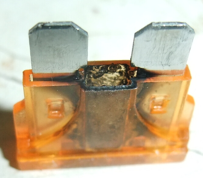 Die Absicherung der 48Volt Versorgung erfolgt mit einer 19mm Autosicherung in der Bauform “normOTO”. Beim Auftrennen einer 48Volt Leitung ist ein Lichtbogen zu erwarten, welcher erst bei eine Länge von mehr als 5mm unterbrochen werden kann. Dieser Abstand wird bei den Autosicherungen mit 5,7mm nur knapp überschritten, weshalb diese korrekterweise nur für Spannungen bis 32 Volt spezifiziert sind. Wie man im Foto bei einer abgeschmolzenen 5 Amp normOTO Sicherung an der schwarzen Füllung sehen kann, geht es mit dem Lichtbogen dabei schon ganz gut zur Sache. Aus diesem Grund ist es ein Vorteil, die nur unwesentlich teureren und im Schaltbild angegebene Autosicherungen vom holländischen Hersteller iMaxx im Keramikgehäuse mit Sandfüllung zu verwenden. Diese Sicherung ist auch im Datenblatt zur Verwendung mit DC Spannungen bis 80 Volt spezifiziert.