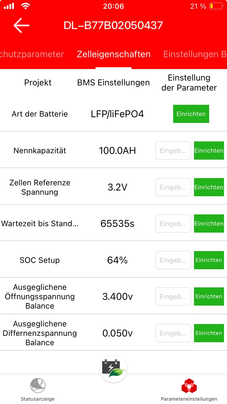 Die erste Einstellung würde ich erst einmal auf 3,65V stellen es sei den Dein Akku verträgt mehr. Die Balancerstartspannung ist erst auf der nächsten oder übernächsten Seite die zweite Einstellung von unten. Als unterstes kann man die Differenzspannung zwischen niedrigster und höchster Zellspannung einstellen. Den Balancerstrom kann man nur bei aktiven Balancern einstellen. Ich glaube nicht das das BMS einen hat. Ich habe zur Zeit keine Bluetoth Verbindung um die genauen deutschen Texte der Einstellungen zu suchen.