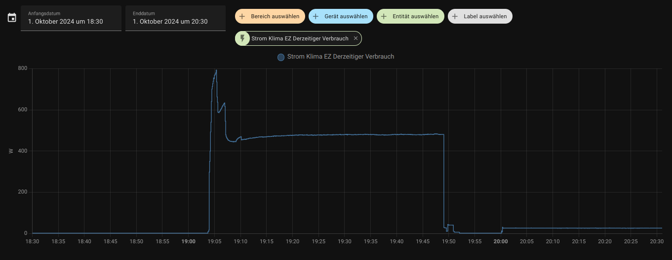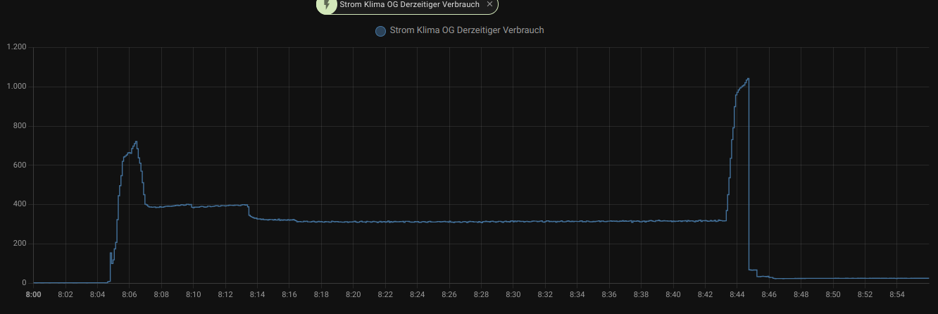 Die meisten Anlagen starten erstmal mit einer recht hohen Leistung so im Bereich 500-1000 Watt. Das ist technisch bedingt, damit sich z.B. das Öl richtig verteilen kann, dann muss erstmal Druck aufgebaut werden, alles auf Temperatur kommen und sich der Kältekreislauf stabilisieren. Erst danach modulieren die dann runter. Wie lange das dauert, ist von Anlage zu Anlage verschieden. Bei meiner MHI dauert es je nach Situation 2-5 Minuten.