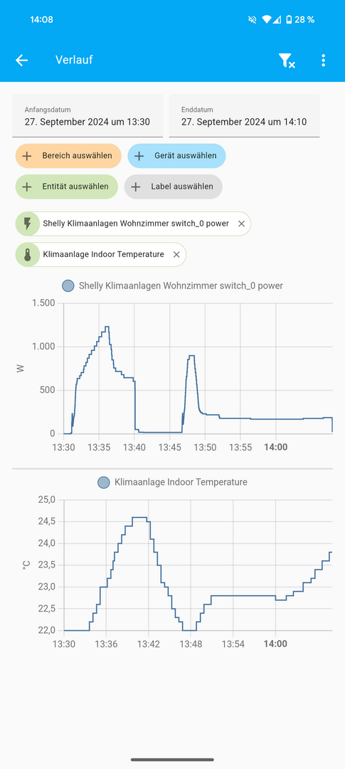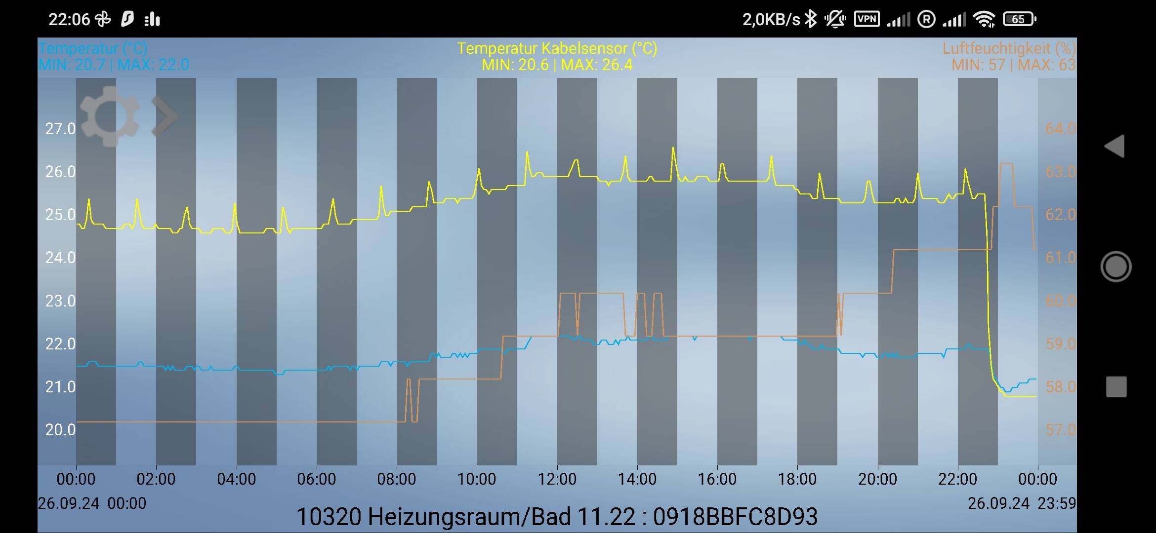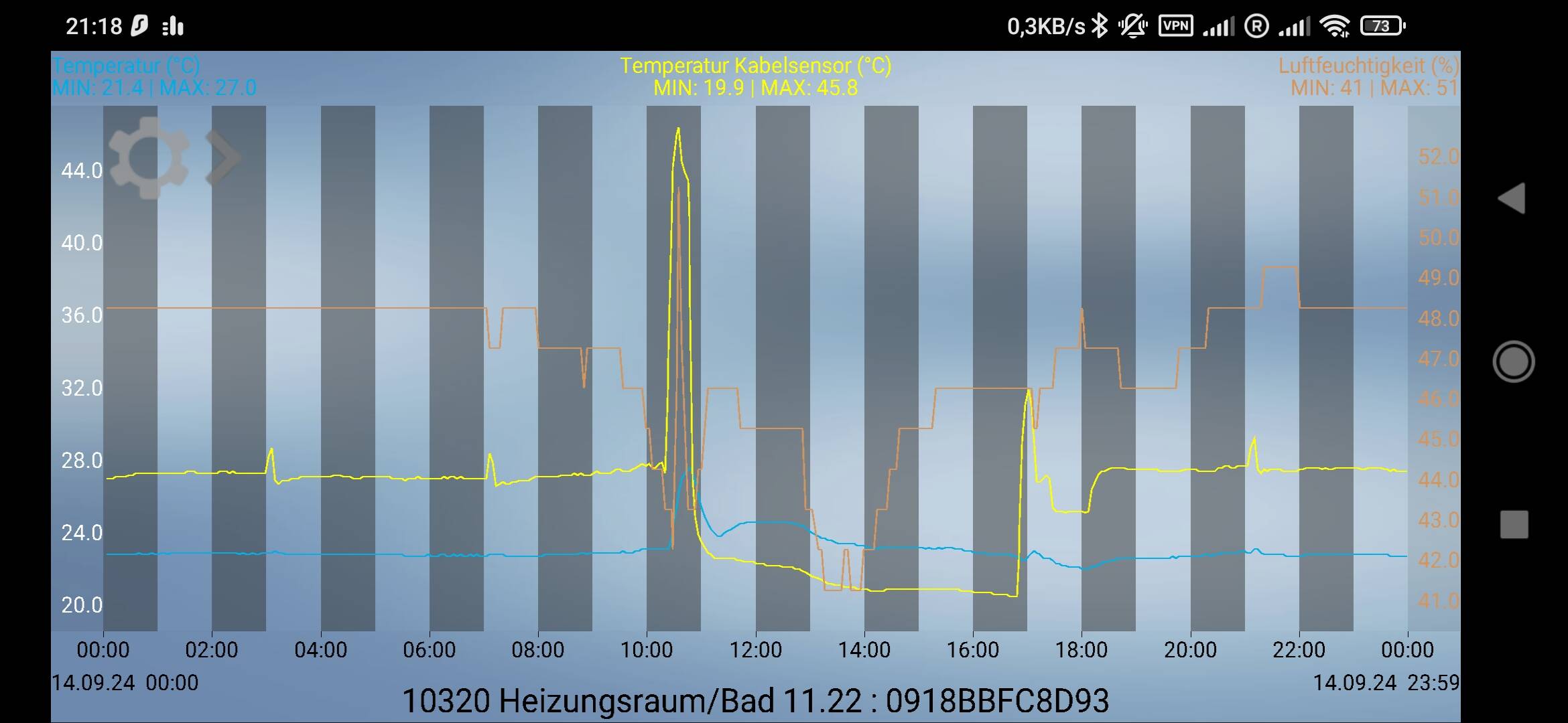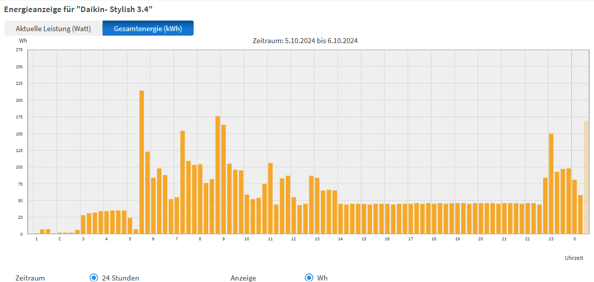 Beispiel vom 14.9. Gelbe Linie ist Auswurf. Blau nicht Beachten. Beim großen Ausschlag hat jemand geduscht. z.B. Von 0 bis 10 Uhr durchgehend zwischend 26,4° und 26,7° Auswurf ohne Takt. Tagesverbrauch 2,2 KWh. Tagestemperatur zwischen 9 und 17°. Innentemperatur durchgehend 20 bis 20,5° (ausser mehr beim Duschen).