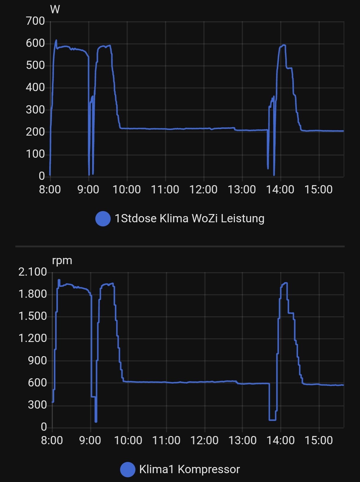 Das Muster sieht auch typisch aus. Der Kompressor ändert seine Frequenz in Sprüngen. Du dürftest auch Schwankungen im Stromverbrauch sehen wenn sich die Außentemperatur ändert, selbst wenn der Kompressor gleich bleibt.